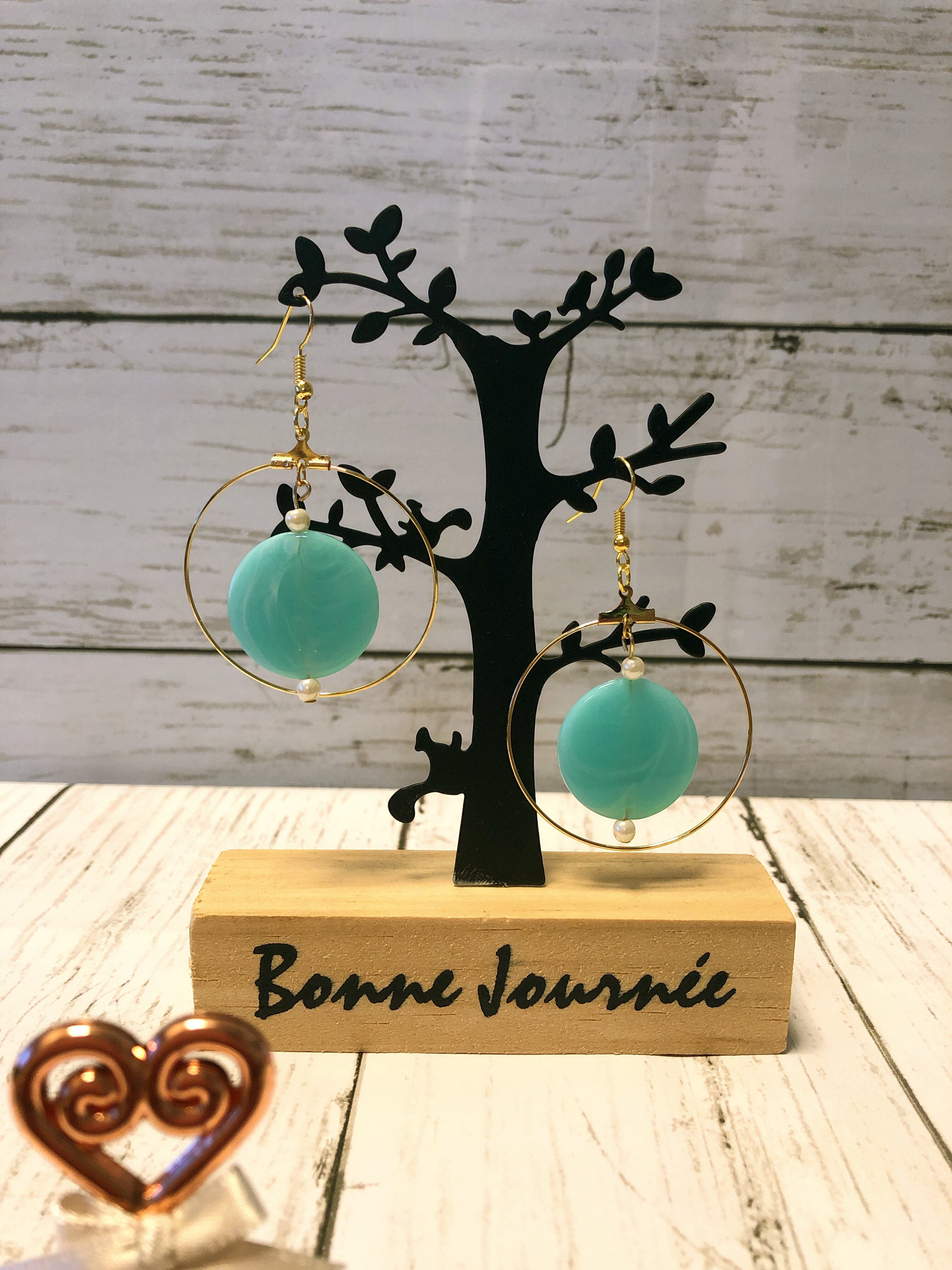 ラウンド型ピアスにエメラルドグリーンのパーツを組み合わせました。