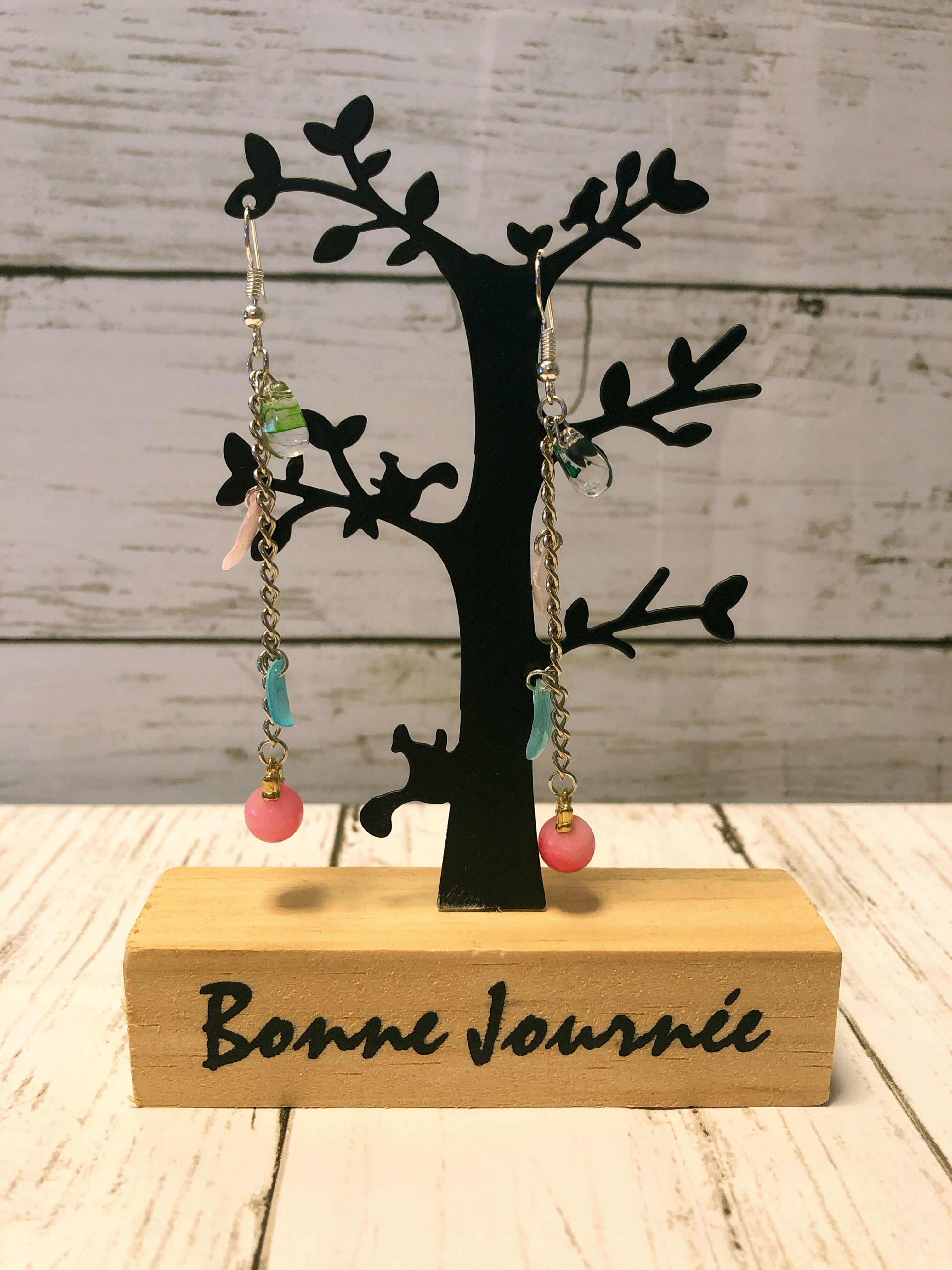 チェーンにガラスパーツとピンクとブルーの紫陽花の花びらを付け、1番下にはピンクのラウンドパーツがついたピアスです。