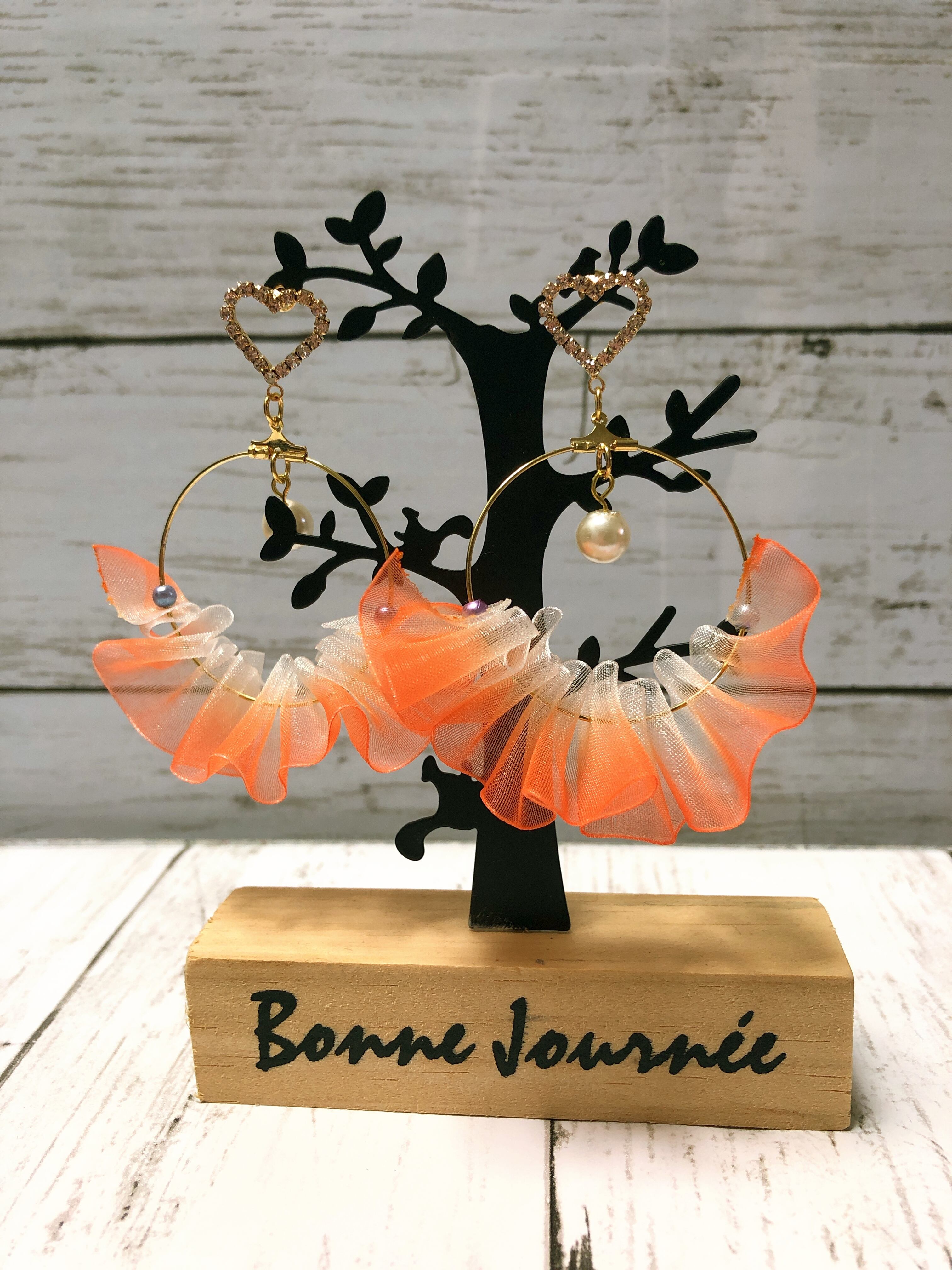 ラウンド型のピアスにオレンジグラデーションのリボンを組み合わせました。