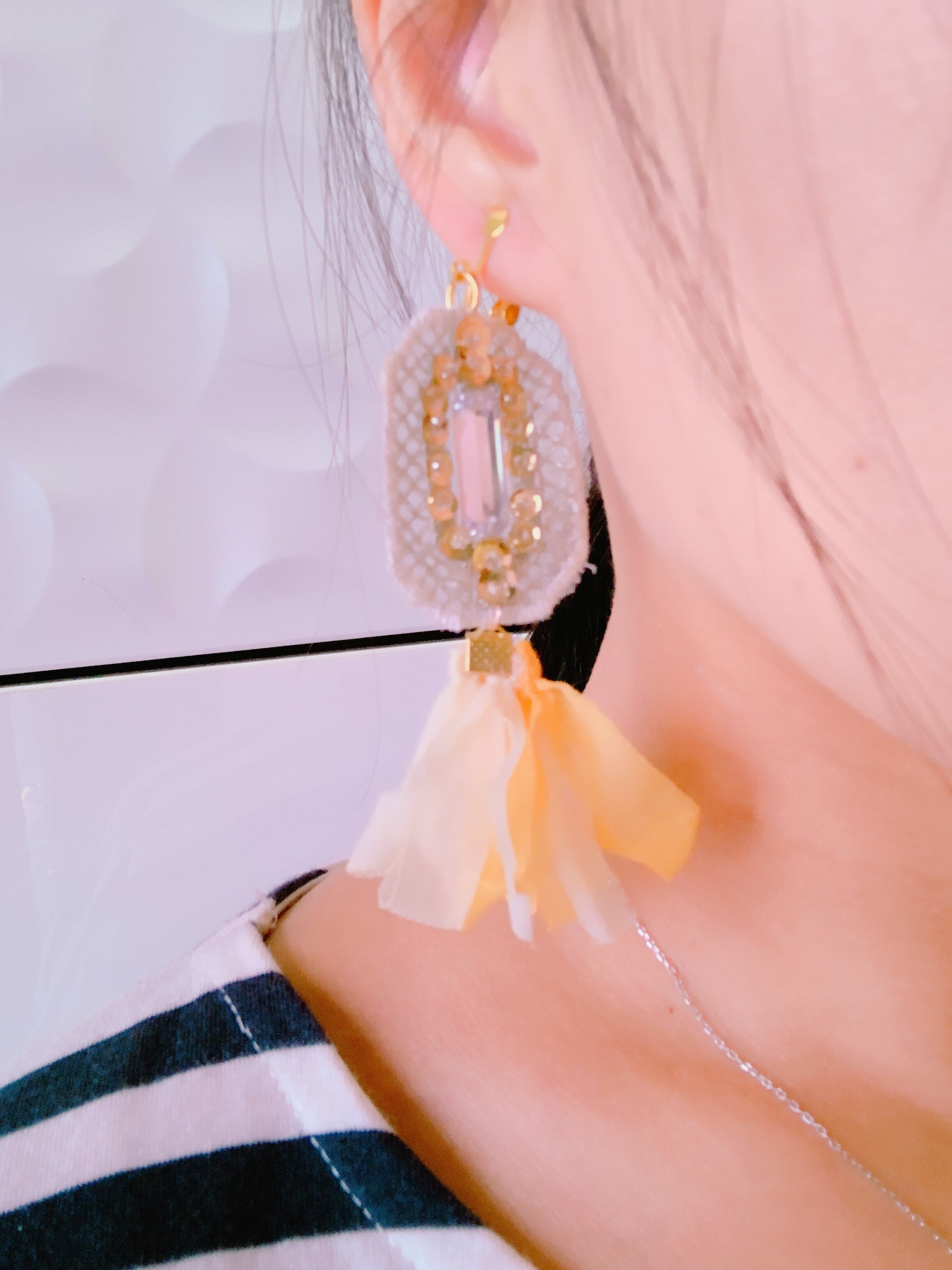 黄色のシフォンタッセルでふんわり柔らかい雰囲気のアクセサリーになりました。